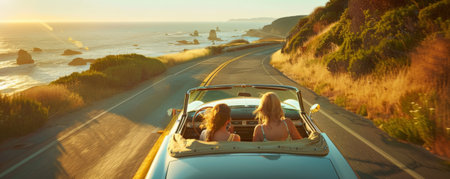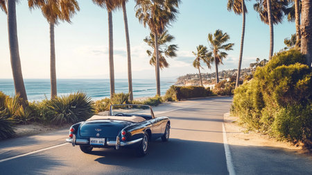 A vintage convertible cruising down a coastal highway, the ocean breeze mingling with the scent of salt and freedom.