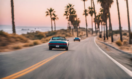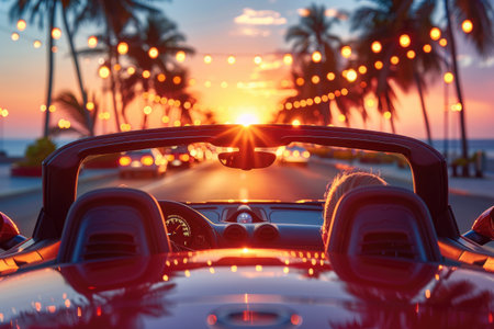 Vintage convertible car driving along a scenic tropical coast at sunset, offering breathtaking views of the ocean, palm trees, and islands