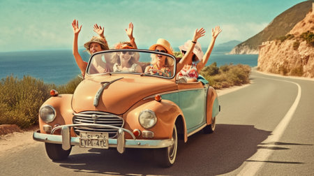 Generative AI : Group of friends having fun at car trip around Europe on their convertible car