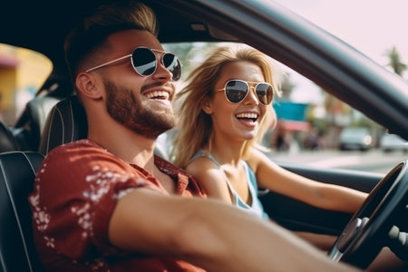 Generative AI : Happy couple driving on city street in convertible car Friends rent cabrio auto on vacation Roadtrip freedom travel and transport rental service concept