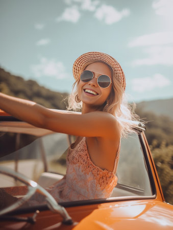 Generative AI : Happy young woman takes a selfie on a convertible car at vacation at summertime