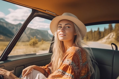 In her own style Attractive young smiling woman looking out the vans window and adjusting her hat while enjoying the car travel with her boyfriend : Generative AI