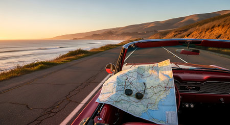 Car with map on the road at sunset. Car travel concept.