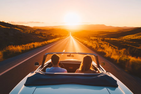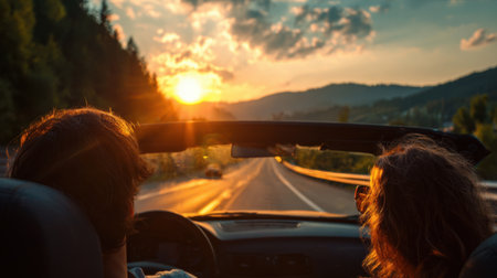 Scenic sunset drive two people enjoying an open top car journey on a winding road