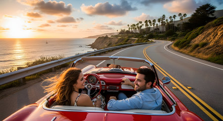 A happy young couple driving a classic red convertible car along a scenic coastal highway. The sun is setting over the ocean, creating a beautiful, romantic scene of a road trip and freedom.