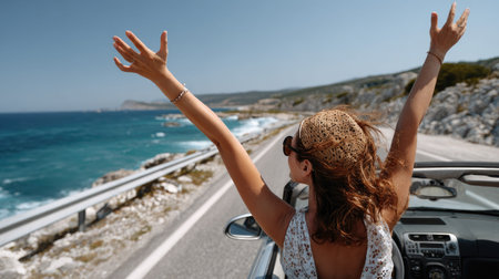 A joyful woman with arms raised enjoys the ocean breeze while driving a convertible along a beautiful coastal road, embodying freedom and happiness.