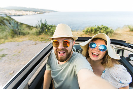 Romantic couple making selfie on smartphone camera in rental cabrio car on ocean or sea beach enjoying summer vacation together and taking picture on cellular resting near sea on weekends