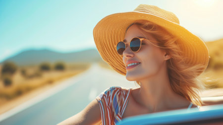 Smiling woman in a hat enjoying a sunny road trip