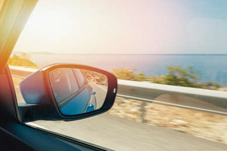 Close-up of side mirror of the moving car with reflection of the sea. Summer travel. Warm glow effect