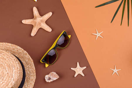 Beach accessories. Various creams, glasses, hat and towel with sea shells on a colored background. Top view. Flat Lay.