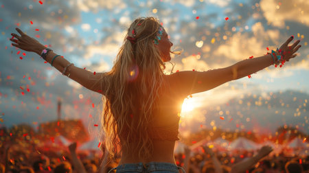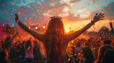 Evening outdoor music festival atmosphere enriched by colorful confetti cascading under vibrant lights, igniting joy