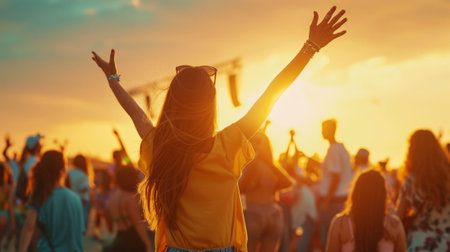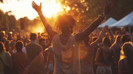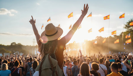 A vibrant outdoor scene capturing the energy of a music festival or concert at sunset. The focal point is a person seen from behind, wearing a straw hat and raising their arms in celebration, illuminated by the warm glow of the setting sun. The background features a large crowd of attendees and numerous small, square orange flags. The atmosphere is joyous and full of collective excitement, with a beautiful lens flare adding to the golden hour mood. This depiction emphasizes the experience of live events, community, and enjoyment under an open sky.