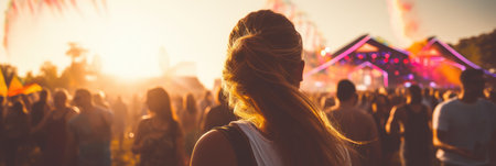 a vibrant outdoor music festival at sunset, capturing the energy of the crowd enjoying live music, drinks and the summer atmosphere. Fun and excitement