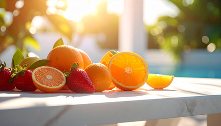Fresh fruits like strawberries and oranges are displayed on a table outdoors, with a hint of a blue pool in the background and bright sunlight.