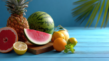 A vibrant arrangement of summer fruits including watermelon, oranges, kiwi, and pomegranate scattered on a cheerful blue surface for a playful aesthetic.