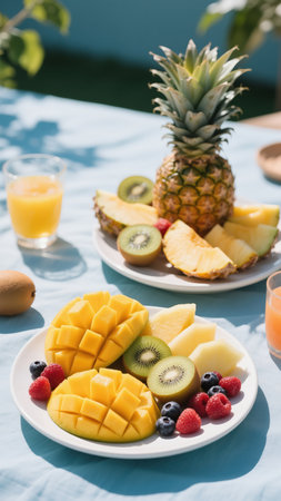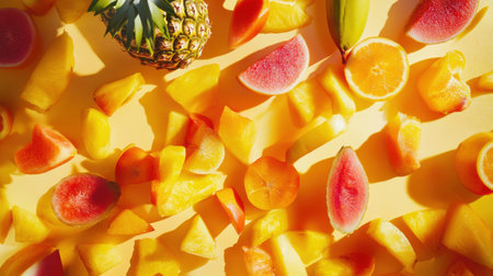 Brightly sliced tropical fruits like pineapples, mangoes, and papayas are beautifully displayed against a vivid background.
