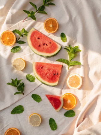 Fresh watermelon, lemon, orange slices and mint leaves arranged on soft white fabric under warm natural light, concept of summer freshness