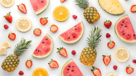 An array of vibrant fruits including orange slices, strawberries, and blueberries are artistically arranged on a clean white background, showing their fresh colors and textures.
