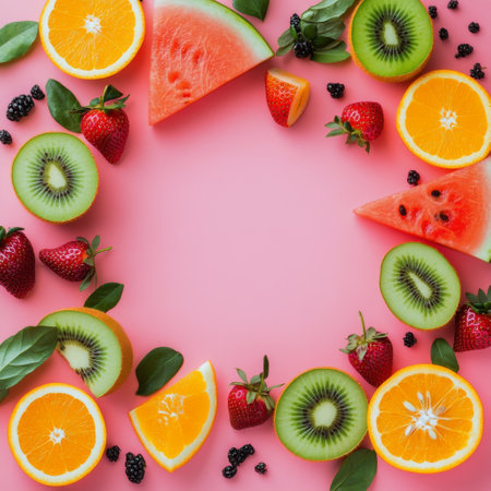 A colorful mix of fresh fruits including watermelon, kiwi, strawberries, and oranges is displayed on a pink surface. The vivid colors create a cheerful and inviting atmosphere.