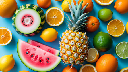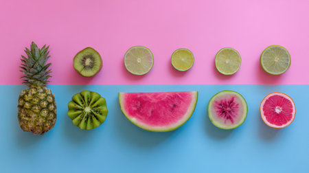 A lively display of fresh fruits such as pineapple, lime, kiwi, watermelon, and grapefruit on a pink and blue background, perfect for promoting healthy eating and summer vibes.