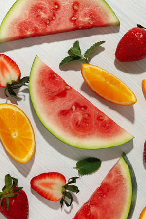 A vibrant and refreshing assortment of sliced fruits, including watermelon, oranges, strawberries, and blueberries, arranged on a light-colored surface.