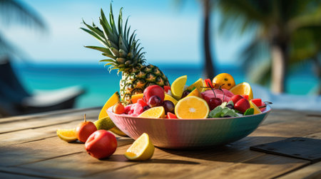 Fruit salad in a bowl on a wooden table on a tropical beach