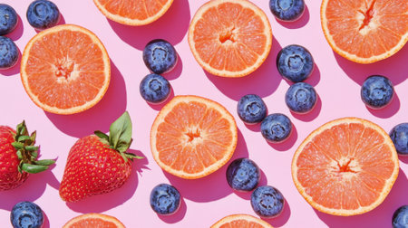 A flat lay of halved pink grapefruit, blueberries, and strawberries on a pink background.