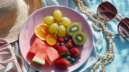 Fresh summer fruit platter displayed with beach accessories on a sunny day