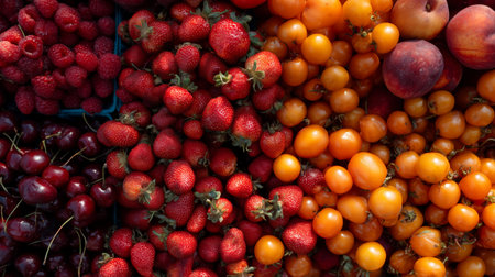 A close up of a variety of fruits including cherries, blueberries, and strawberries. Concept of abundance and freshness, with the bright colors of the fruits creating a lively and inviting atmosphere