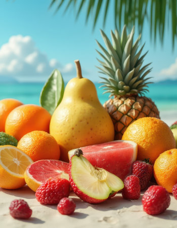 A variety of fruits, including pineapple, oranges, strawberries, and watermelon, are displayed on a white surface near the beach