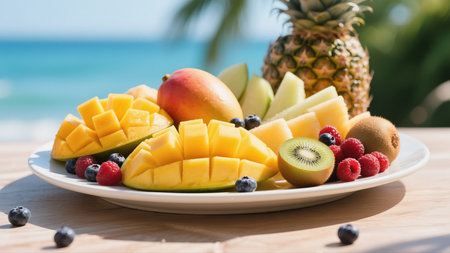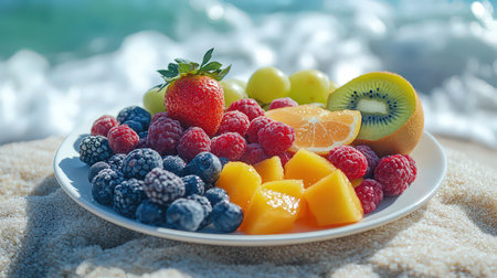 A vibrant plate featuring various fresh fruits placed against a stunning summer sea backdrop.