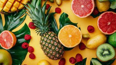 Colorful arrangement of tropical fruits such as pineapple, mango, kiwi, and grapefruit, with raspberries and green leaves on a vibrant yellow background.