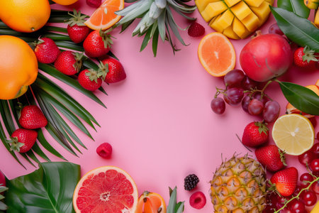 A vibrant collection of fresh fruits including citrus, berries, and tropical varieties displayed on a colorful background, ideal for summer promotions and healthy lifestyle themes.