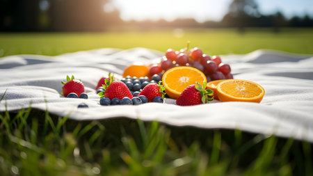 A white picnic blanket spread on green grass is laden with fresh fruits including strawberries, blueberries, oranges, and grapes. The sunny outdoor setting invites a healthy and relaxing summer snack.