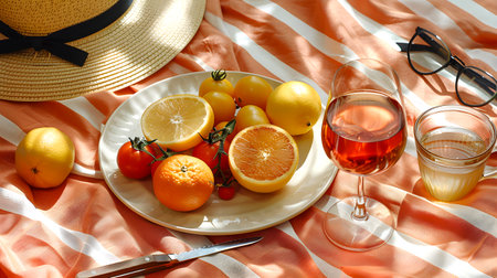 Summer picnic on an orange and white striped fabric that suggests a summery or vacation theme, food to go.Summer Still Life with Citrus and Wine.