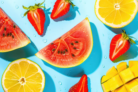 Watermelon, lemon, strawberries, and mango arranged on a blue background.