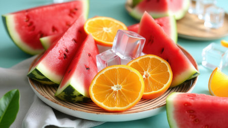 Watermelon and orange slices, adorned with ice cubes, sit enticingly on a plate. This image exudes a fresh and juicy appeal, perfect for summer-related themes and healthy lifestyle promotion.