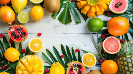 A diverse selection of tropical fruits and leaves displayed on a wooden table, perfect ingredients for creating exotic cuisine dishes and natural food recipes AIG50