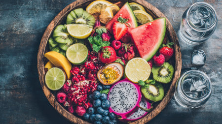 Top-down view captures a generously filled wooden serving tray overflowing with an assortment of sliced and whole fresh fruits, including bright red watermelon, vibrant kiwi, sliced limes, strawberries, blueberries, raspberries, pomegranate seeds, mango, passion fruit, and striking white dragon fruit, artfully arranged for presentation. Two glasses filled with ice water sit beside the platter on a dark, textured surface, suggesting a healthy, cooling indulgence.
