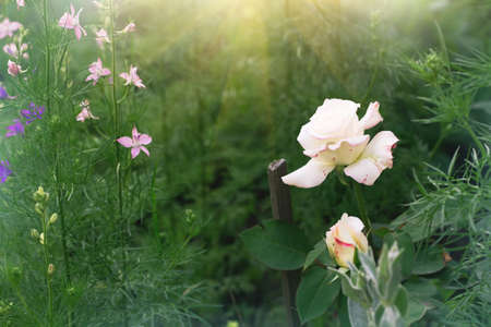 Lush flowerbed with roses and sunflowers in sunlit garden