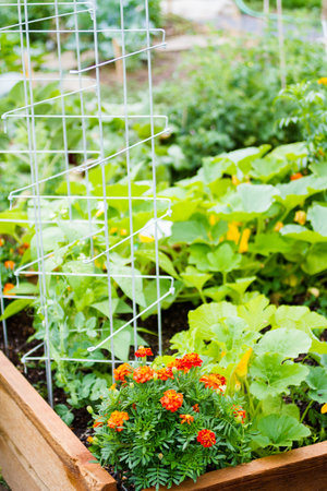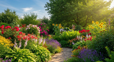 Vibrant flowerbed in a sunlit garden with lush greenery