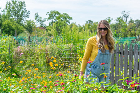 stylish young woman in denim overalls smiling and walking through community garden in summer