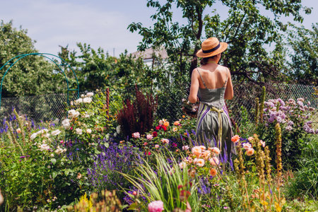Woman gardener in straw hat walking around her summer garden admiring roses flowers. Checking plants