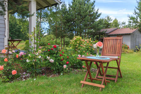 Romantic sitting area in the rose garden, round wooden table and chairs near the large flowering bushes of English roses.