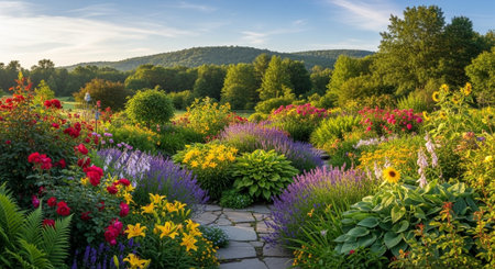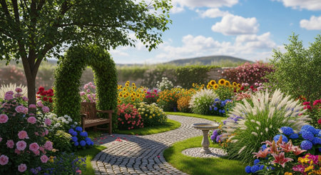 Vibrant flower garden landscape with colorful blossoms in bloom