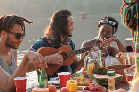 Group of young people playing on guitar and singing while sitting at dining table during lunch outdoors