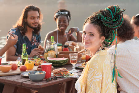 Portrait of young woman looking at camera while having dinner at the table together with her friends outdoors