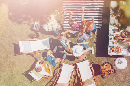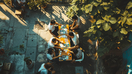 Top view of group of people playing board game together in the garden.
