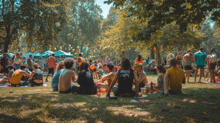 An image capturing a multicultural gathering in a vibrant city park, where people of different ages, cultures, and backgrounds come together in celebration, showcasing unity and the beauty of diversity.