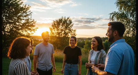 Group of friends talking and laughing while walking in the field at sunset
